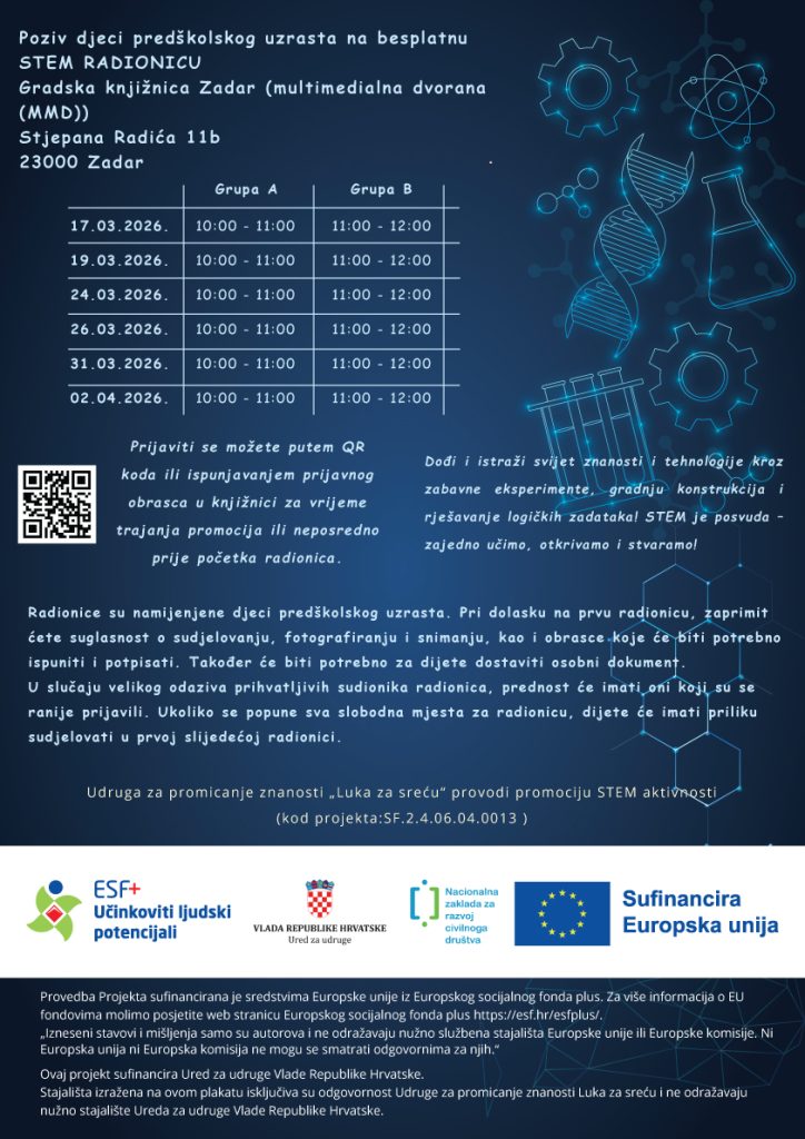 Udruga za promicanje znanosti Luka za sreću provodi javni poziv za iskaz interesa u sklopu projekta „STEM igrice“ sufinanciranog iz Europskog socijalnog fonda plus za sudjelovanje djece na radionicama iz STEM područja.